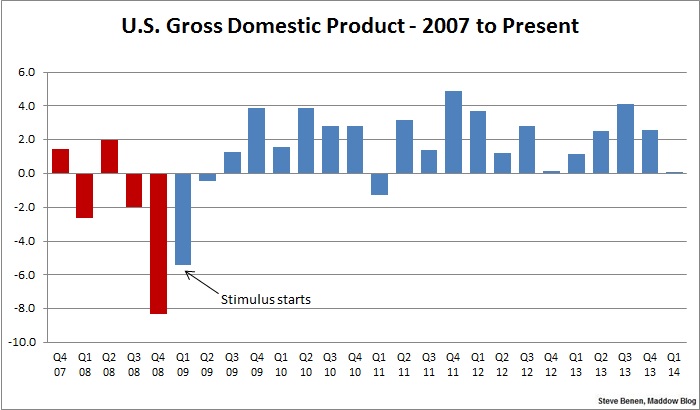 As for the image above, the chart shows GDP numbers by quarter since the Great Recession began. The red columns show the economy under the Bush administration; the blue columns show the economy under the Obama administration.