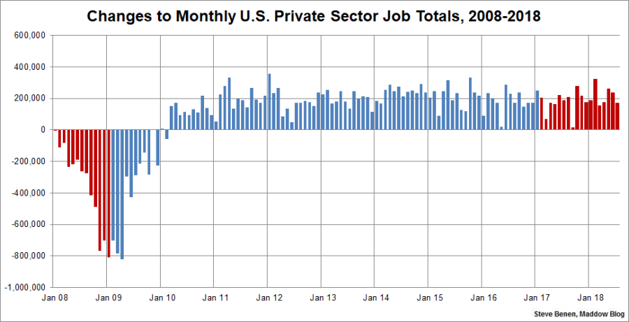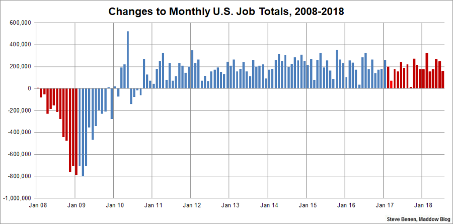 Above you’ll find the chart I run every month, showing monthly changes in total jobs since the start of the Great Recession. The image makes a distinction: red columns point to monthly changes under the Bush and Trump administrations, while blue columns point to monthly job changes under the Obama administration.