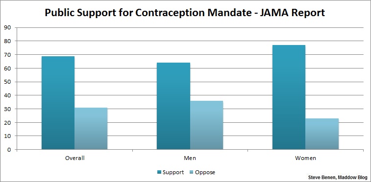 By this measure, the fact that only 69% back contraception coverage might seem less impressive, but that’s foolish — when more than two-thirds of the public supports a health care policy, that’s pretty one-sided.