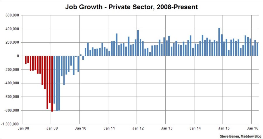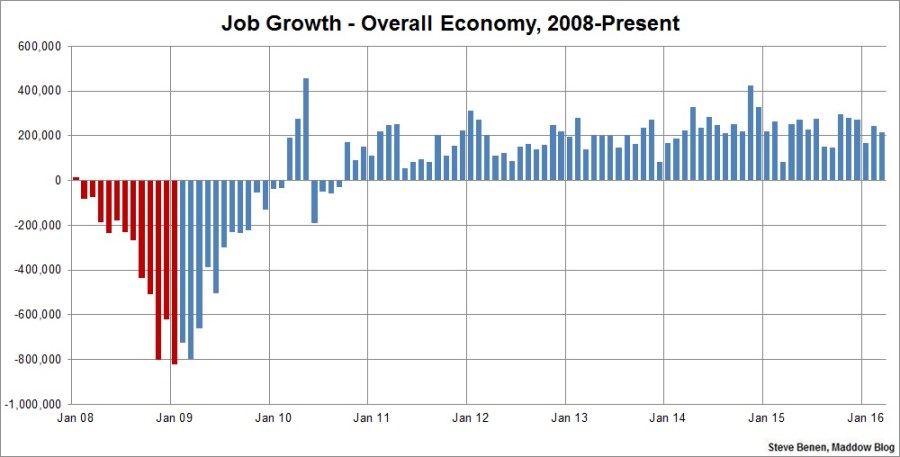 Above you’ll find the chart I run every month, showing monthly job losses since the start of the Great Recession. The image makes a distinction – red columns point to monthly job totals under the Bush administration, while blue columns point to job totals under the Obama administration.