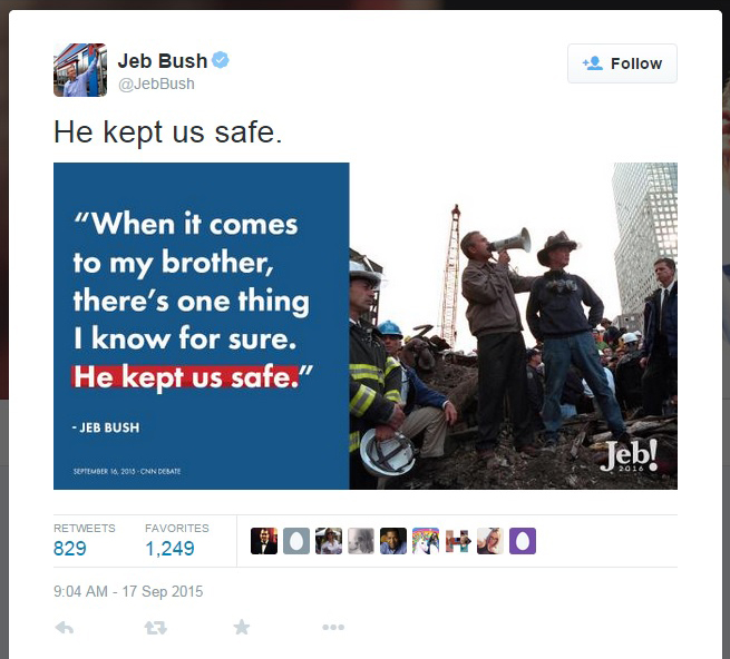 I’ll confess that when I first saw the tweet, I assumed it was a rude joke. In fact, it seemed obvious that the message had come from a Bush critic, not Bush himself — it juxtaposes Jeb’s rhetoric at the debate with an image of his brother standing atop rubble caused by a terrorist attack that occurred on his watch. The message seemed inherently self-defeating — there’s Jeb Bush saying his brother kept us safe, alongside a photograph documenting evidence that his brother did not keep us safe.