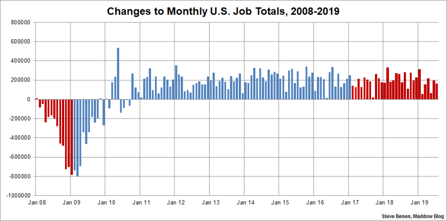 The Bureau of Labor Statistics reported this morning that the economy added 164,000 jobs last month, while the unemployment rate remained unchanged at 3.7%. And while that’s a decent monthly total, the revisions from the previous two months were a little disappointing: job totals from May and June were both revised down, subtracting 41,000 from previous reporting.