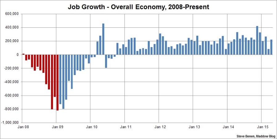 Above you’ll find the chart I run every month, showing monthly job losses since the start of the Great Recession. The image makes a distinction — red columns point to monthly job totals under the Bush administration, while blue columns point to job totals under the Obama administration.