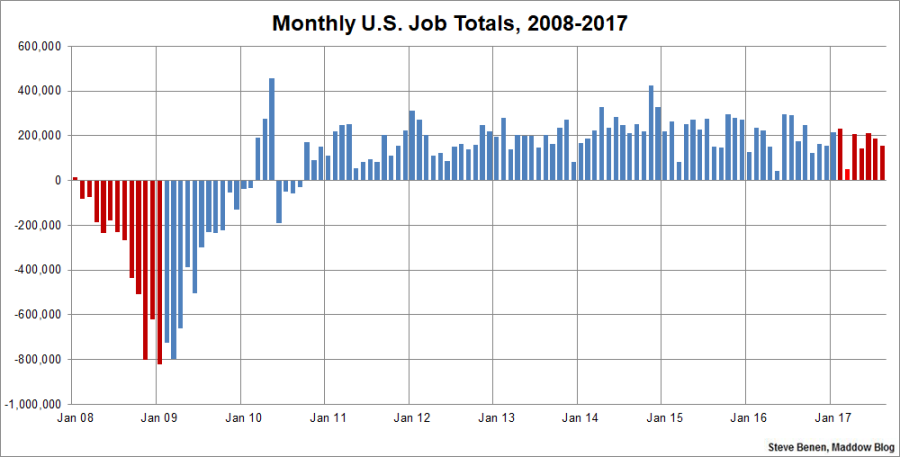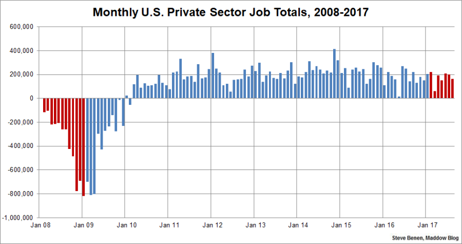All told, if current averages keep up, we’re on track to see the U.S. economy add about 2.1 million jobs this calendar year, which isn’t bad, but which would fall short of last year’s totals. In the first eight months of last year, 1.55 million jobs were created, while in the first eight months of this year, the total is 1.4 million.