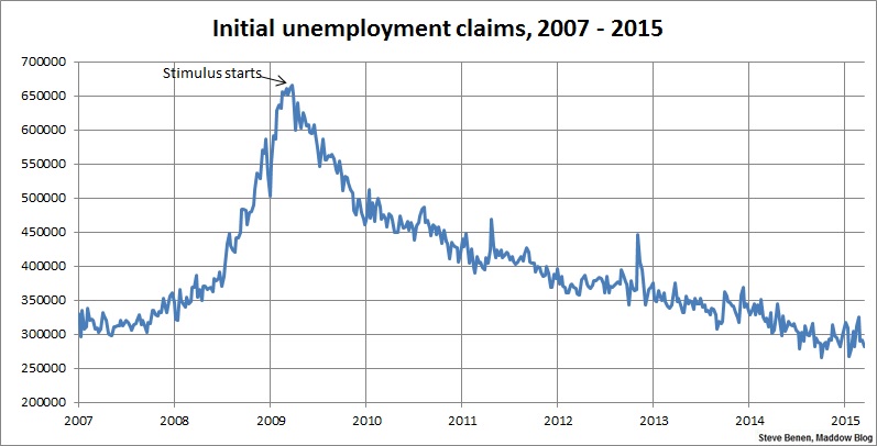 Above you’ll find the chart showing weekly, initial unemployment claims going back to the beginning of 2007. (Remember, unlike the monthly jobs chart, a lower number is good news.) For context, I’ve added an arrow to show the point at which President Obama’s Recovery Act began spending money.
