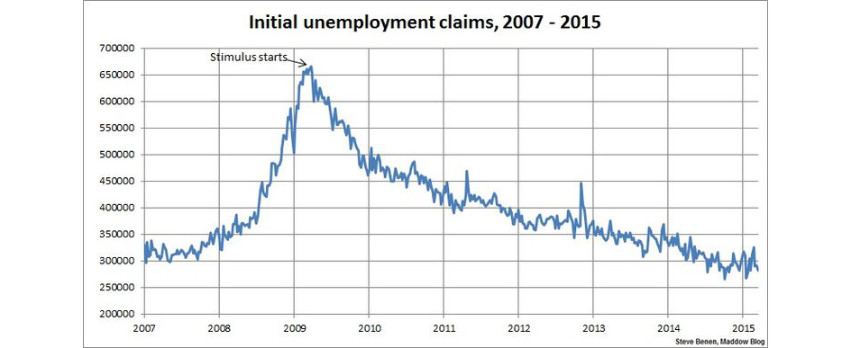 Above you’ll find the chart showing weekly, initial unemployment claims going back to the beginning of 2007. (Remember, unlike the monthly jobs chart, a lower number is good news.) For context, I’ve added an arrow to show the point at which President Obama’s Recovery Act began spending money.