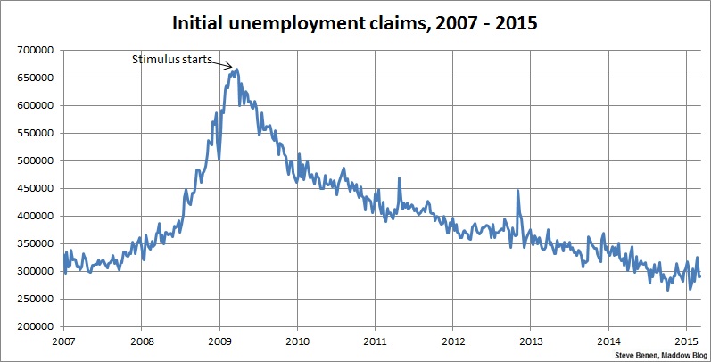 Above you’ll find the chart showing weekly, initial unemployment claims going back to the beginning of 2007. (Remember, unlike the monthly jobs chart, a lower number is good news.) For context, I’ve added an arrow to show the point at which President Obama’s Recovery Act began spending money.
