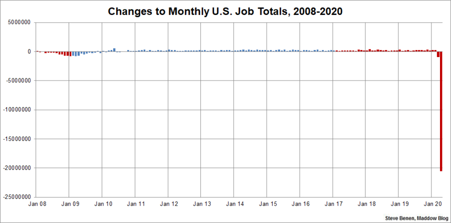 Far more recently, in March 2009, the economy lost 800,000 jobs in a single month, as the Great Recession took its toll. At the time, it seemed difficult to imagine a more severe jobs crisis.