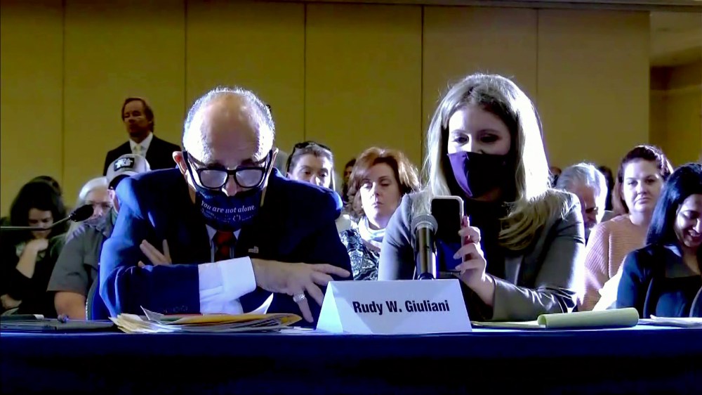 Trump, who was reportedly planning to appear at this faux hearing before changing his plans, addressed those in attendance by way of Jenna Ellis, who literally held her cellphone up to a microphone, enabling the president to peddle nonsense like this: