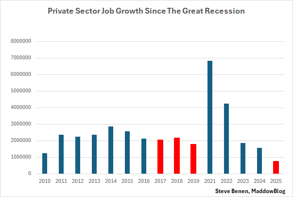 In fairness, it’s important to emphasize that the 2025 data isn’t fully complet. It doesn’t include December’s totals, which won’t be released until early January. That said, barring some kind of miracle this month, this year will be the worst year for private-sector job growth since 2009, at the height of the Great Recession.