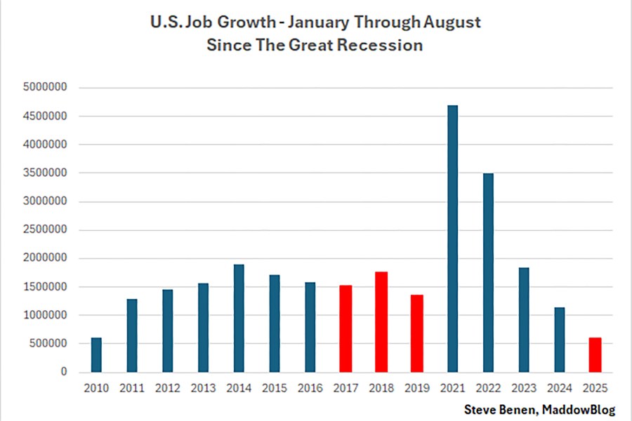 And then, of course, there’s the job market, which keeps getting uglier, with job growth falling to its lowest levels since the Great Recession. Consider this chart showing job creation through the first eight months of the year since 2010. (The blue columns reflect years in which there were Democratic administrations, while the red columns reflect Trump’s terms. Because of the pandemic, I’m excluding 2020. For those who might be curious, the data from 2010 was just a smidge better than 2025, though it might not be immediately obvious in the image.)