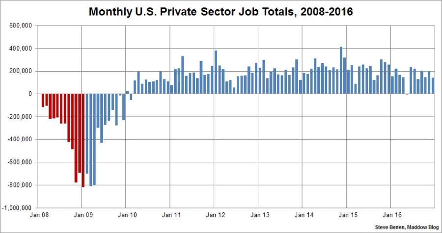 President Obama won’t leave office for another two weeks, but this morning brought the final jobs report of his second term. It offered the latest in a series of reminders that the president is handing off a healthy economy to his successor (who spent 2016 telling voters the economy is terrible).The Bureau of Labor Statistics reported this morning that the U.S. economy added 156,000 jobs in December. The unemployment rate, meanwhile, remains low, inching higher from 4.6% to 4.7%. It’s the 15th consecutive month the rate has been at 5% or lower. (Remember when Mitt Romney said he might be able to get the jobless rate down to 6% by the end of his first term? I do.)As for the revisions, October’s and November’s job totals were both revised up, adding a net gain of 19,000.Also of interest, this report showed a larger-than-expected hike in average hourly earnings, suggesting not only that job growth is steady, but American wages are improving, too.Though the latest data still faces some revisions, the preliminary estimates now show the overall economy added 2.15 million new jobs in 2016, which is a pretty healthy number. What’s more, December was the 75th consecutive month of positive job growth, which is the longest on record.Remember, as we discussed last month, as far as Republicans are concerned, results like these were completely impossible. For the right, the combination of the Affordable Care Act, higher taxes, and assorted regulations would stifle job growth and push the economy into a recession, but the exact opposite happened. Nevertheless, Donald Trump and GOP lawmakers believe they’ll “get the economy moving” by undoing the policies that brought us to this point.We’ll see how that works out.Above you’ll find the chart I run every month, showing monthly job losses since the start of the Great Recession. The image makes a distinction — red columns point to monthly job totals under the Bush administration, while blue columns point to job totals under the Obama administration.Update: Here’s another chart, this one showing monthly job losses/gains in just the private sector since the start of the Great Recession.