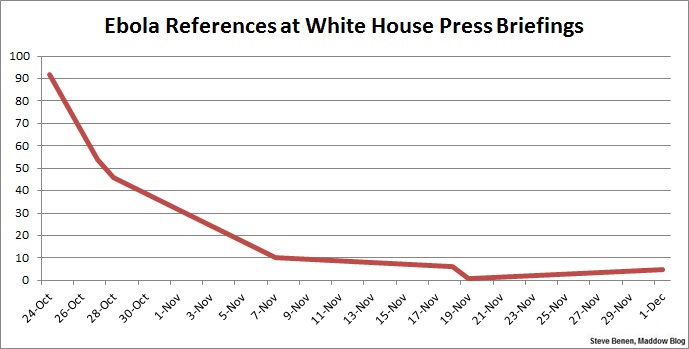 San Stein noted this morning that the word “Ebola” was mentioned 92 times during the Oct. 24 White House press briefing, before dropping to single digits over the last couple of weeks. The drop-off was so striking, it calls for a chart.