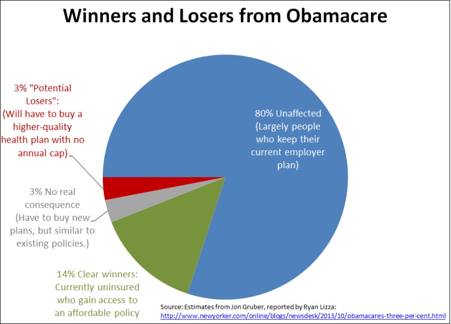 To be sure, the point isn’t to say that those 3% in the red slice are unimportant. Obviously, everyone matters. Rather, if all you relied upon was general media coverage over the last several days, one might assume that that the “losers” under the Affordable Care Act represented nearly 100% of the U.S. population.