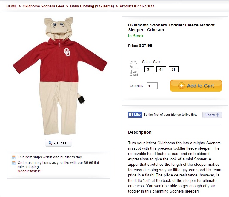 Also available: the Oklahoma Sooners Girls Toddler Stardust Fleece Sweat Set in crimson and the (perhaps) criminal Oklahoma Sooners Youth T-Shirt, Hoodie and Pants Set in crimson or white, your choice. Then we have the Oklahoma Sooners Toddler Fleece Mascot Sleeper, in crimson. “Removable hood features ears and embroidered expressions to give the look of a mini Sooner,” or miscreant.