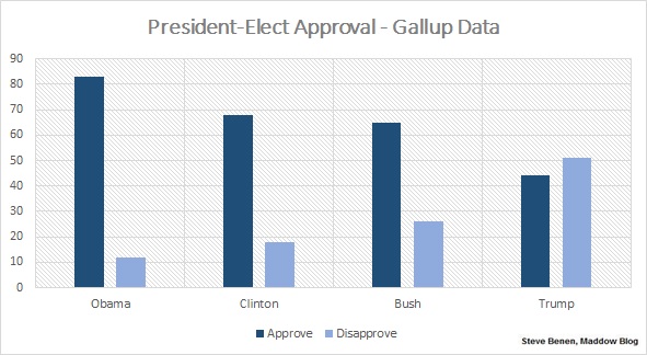 I put together the above chart to help drive the point home: by the standards of the last quarter-century, Trump is faring quite poorly during his post-election “honeymoon” phase. Ordinarily, once a campaign is over, most Americans generally extend support to the incoming leader. This year, as the public watches Trump’s bizarre antics unfold during his transition period, the president-elect’s 44% approval is actually a little lower than the 46% of electorate that voted for him.There’s a school of thought that says polling results like these are irrelevant, at least for now, because the next election cycle is still nearly two years away. Trump’s approval numbers will matter far more in October 2018 than in January 2017.And while that’s true in terms of electoral consequences, let’s not forget that Trump intends to push a series of radical and unpopular proposals in the coming months, which generally requires some semblance of political capital. The president-elect suggested this week he’ll try to get his way by hitting the campaign trail and rallying the public behind his agenda.But while the laws of campaign political science took a hit last year, the laws of political incentives haven’t changed much: members of Congress who are skeptical of the incoming president’s ideas won’t feel much pressure to go along with an unpopular and scandal-plagued leader. Trump has already hit the campaign trail — before and after Election Day — but his standing is nevertheless weaker than any of his modern predecessors.