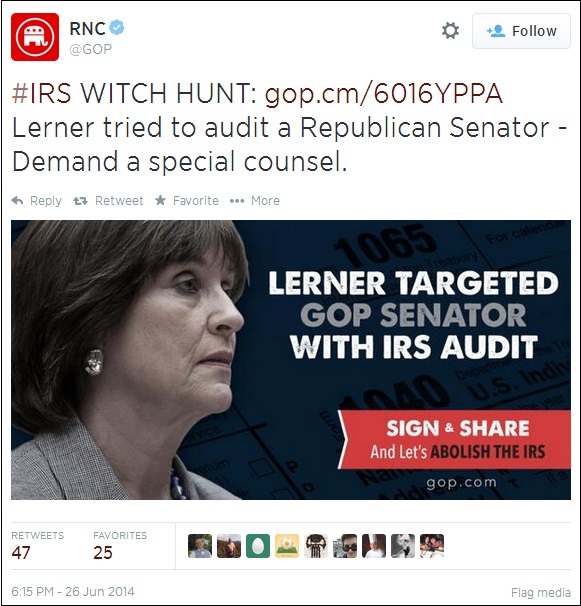 The Republican National Committee, for example, last night published a tweet about the “IRS witch hunt” in which Lerner “tried to audit a Republican senator.” It included a handy image for conservative activists to share via social media that read in all caps, “Lerner targeted GOP senator with IRS audit.”