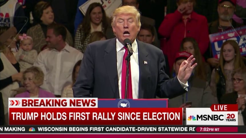 He talked about the “fun” of fighting Hillary Clinton; he took a few shots at Ohio Gov. John Kasich (R) for not supporting his campaign; and he took time to ridicule conservative independent presidential candidate Evan McMullin. We heard “lock her up” chants, which Trump greeted with a grin; we heard repeated whining about journalists and news organizations; and we even heard mockery of a protester.If it seemed as if Trump was returning to campaign mode yesterday, there’s a good reason. Indeed, the problem is that Trump never actually left campaign mode.As Rachel has explained on the show this week, there’s ample precedent for presidents hitting the road and holding rallies, but there’s always a point to the outings. Woodrow Wilson held a series of public events to convince the public to support his idea for a League of Nations; George W. Bush held rallies in support of privatizing Social Security; in 2009, President Obama even held some events to tout the benefits of the Affordable Care Act. For that matter, nearly every president has hosted rallies during their re-election bids in the hopes of encouraging Americans to give them a second term.But there doesn’t appear to be anything in the American tradition similar to what Donald Trump did yesterday: he held a public rally for the purpose of celebrating himself, his election victory, and all the amazing things he intends to do once he takes office.A New York Times report added, “Kicking off what was billed as a ‘thank you’ tour, Mr. Trump was incendiary and prideful, hopeful and indicting, vengeful and determined. His staff said the rally was the first of several he will hold before his inauguration next month. His tour is an unusual move for a president-elect, most of whom do not return so quickly to the campaign trail, especially while key cabinet positions remain unfilled.”But Donald J. Trump likes the campaign trail, far more than he likes doing actual work. Rallies are fun; governing is hard and tedious. As we discussed the other day, the president-elect doesn’t have time for “several” public rallies — intended solely to allow Trump to talk about how pleased he is with himself — but these events remain a priority because his focus is on being a celebrity superstar, not rolling up his sleeves and tackling unglamorous tasks.The New Republic‘s Alex Shephard put it this way: “Donald Trump, a man who has a very short attention span and requires instant gratification more or less constantly, loves campaigning because he has a very short attention span and requires instant gratification more or less constantly.”And so, even though the campaign ended last month, it will continue, indefinitely. The concept of a “permanent campaign” has always been based on the idea that the next election cycle begins immediately after the previous cycle ends, making governing extremely difficult, but Trump is ushering in the Permanent Campaign 2.0 — in which the incoming leader remains a candidate, not because he’s worried about losing in four years, but because he simply prefers being a candidate to being a president.It’s a bit like that friend of yours from college who could’ve graduated and moved on to getting a job, but who simply kept taking classes and seeking new degrees because he enjoyed the comforts of being a student — and feared what came next.Stop waiting for the pivot to maturity and stature: there is no difference between pre-election Trump and post-election Trump, and by all appearances, there probably never will be.