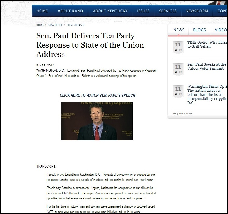 That full transcript was still up as of October 14, according to Google’s cache of the page. Now it’s gone. “Below is a video of his speech,” the page reads. So, yes, you could transcribe the video yourself if you want to search for whether the words he used came from someone else, but Rand Paul’s office won’t make it so easy for you anymore.