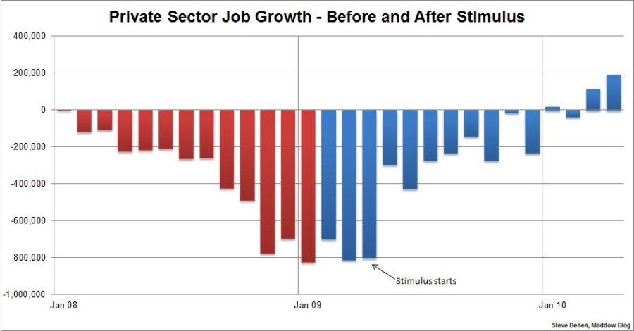 And here’s private-sector job growth before and after the stimulus. Note, once Obama’s Recovery Act kicked in, job growth immediately improved.
