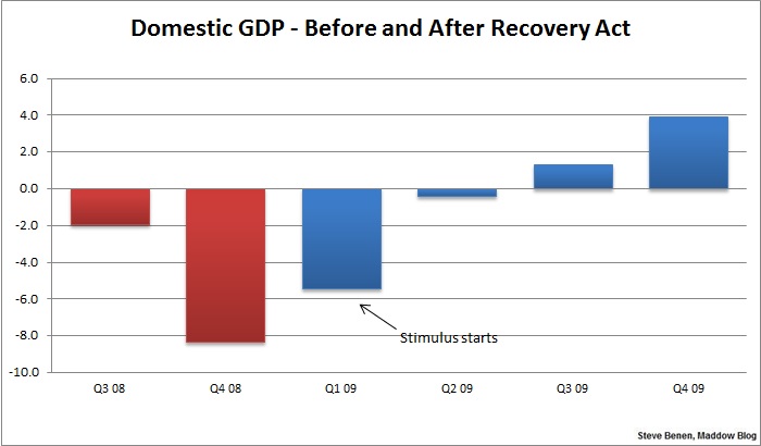 Let’s revisit a piece from a couple of years ago and consider some charts. Here, for example, is the nation’s GDP before and after the Recovery Act. Note, once the stimulus kicked in, the economy immediately started growing.