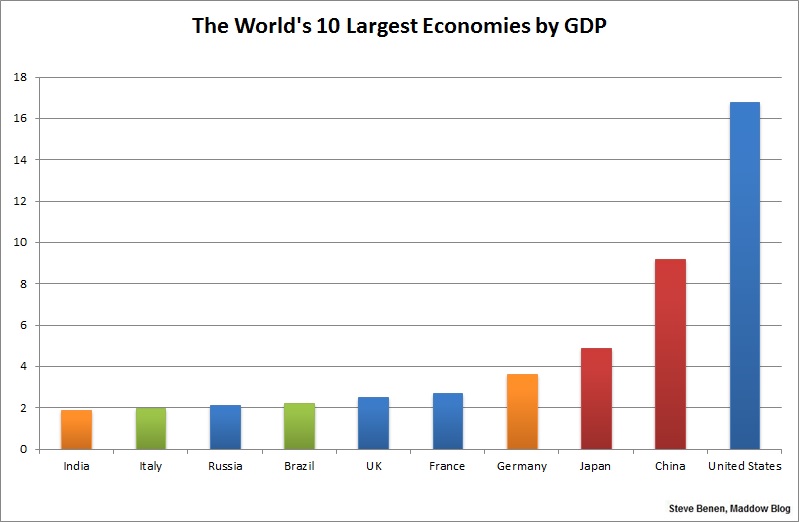 There are different estimates on GDP totals around the world, but I put together this chart based on International Monetary Fund figures published last year. The y axis is in trillions.