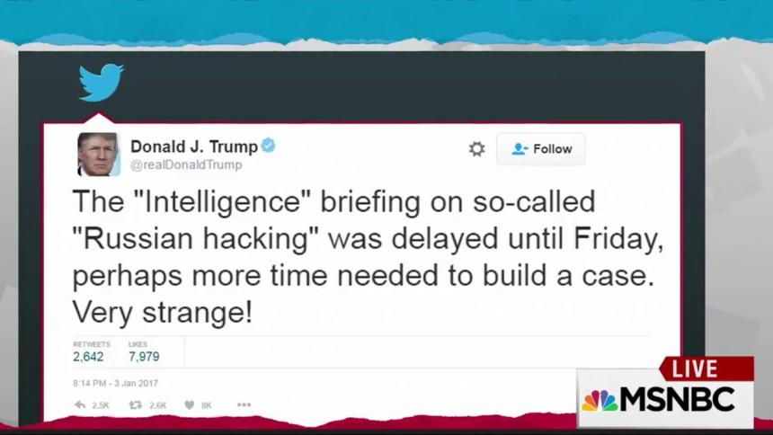 The president-elect took another swipe on Tuesday at the intelligence community that will be under his command in just a few weeks, once again in a tweet.Last week Donald Trump had said he would meet with high-level intel briefers this week to hear more about Russian hacking of the U.S. election…. On Tuesday, Trump tweeted, “The ‘Intelligence’ briefing on so-called ‘Russian hacking’ was delayed until Friday, perhaps more time needed to build a case. Very strange!”