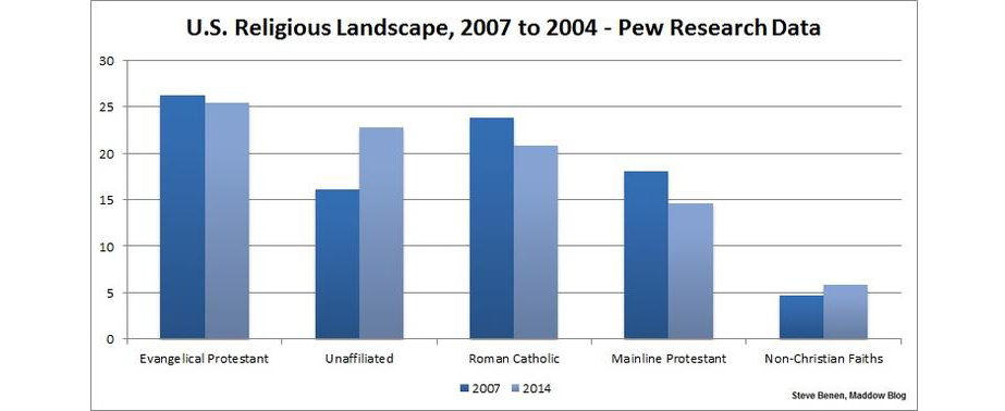 The full report from the Pew Research Center is available online here. Note, in the chart I put together, “Non-Christian Faiths,” refers to Jews, Muslims, Hindus, Buddhists, Sikhs, and others, which combined now represent nearly 6 percent of the U.S. population.
