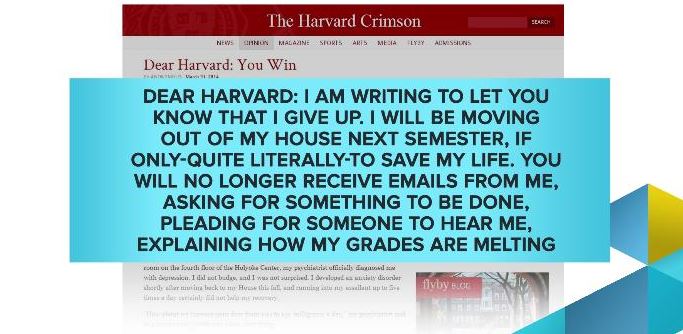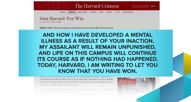 Last Friday, on the show, we touched on the government’s renewed focus in addressing the problem of campus rape and sexual assault. We also talked to Harvard professor Kimberly Theidon, who has worked extensively with survivors of sexual assault and who is amid a controversial lawsuit with the college over alleged violations of Title IX. As Dr. Theidon explained, she was driven to speak out against the school after she witnessed the response to a powerful article that came out in the Harvard Crimson about sexual assault on campus. The article’s comment thread was inundated with “hateful comments aimed at blaming and shaming” the victims. Commenters lashed out at the sexual assault victims both for what had happened to them and for speaking about it. Dr. Theidon went on to say that there has been “a pervasive practice of silencing this problem on campuses and certainly on the Harvard campus.”