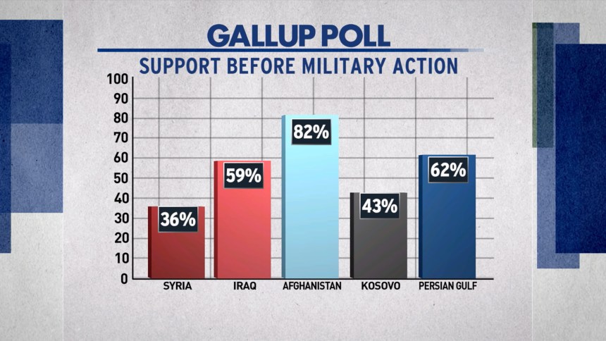 Tuesday night President Obama faces an American public more skeptical about taking military action than ever before. According to a recent NBC News/Wall Street Journal poll, 58% want Congress to vote no on Syria. When we invaded Iraq and Afghanistan, American support was much higher. According to Gallup, 59% were in support of Iraq and 82% were in support of Afghanistan. Even our invasion of Kosovo had greater public support as 43% of Americans were behind the attack. Regardless of Americans support going into conflict, history shows it usually disappears within the first month of the strikes.