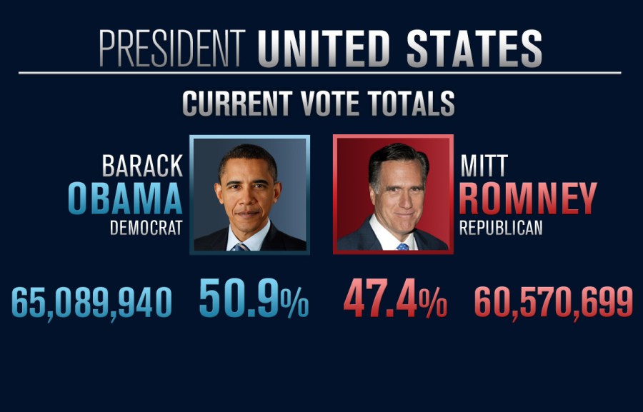 Barack Obama was projected to be the winner of the 2012 election just after 11:00 p.m. eastern on election night. The next day, on Nov. 7, as the election results were still coming in, President Obama had a two point lead in the national vote total or roughly a 2.6 million lead in the raw vote total.