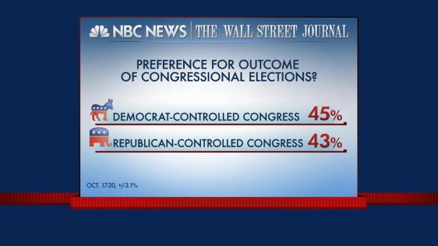 It may be a reflection of polarization or of dissatisfaction with Washington gridlock, but voters also are yearning for one-party control. 44% of voters we polled told us their preference was to have President Obama re-elected with a Democratic Congress; 41% preferred a President Romney and a Republican Congress. Just 8% told us they’d prefer divided government. Some Senate contests have seemed to operate in a vacuum, driven by individual candidates rather than determined by traditional red and blue patterns. But don’t be surprised if Senate fights in some of these states – think Florida and Ohio – end up closer than they’ve appeared; and if races in Nevada, Wisconsin and Virginia come down to the wire.