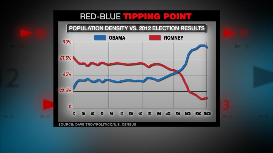 But the folks in the center — literally and politically — are suburban Americans up for grabs. Those Americans, mostly those in lower and middle class white neighborhoods, are politiaclly divided. They’ve switched parties in the last two elections, voting Republican in 2010 and Democrat at 2012. Data from the 2012 election even points to an exact tipping point — right around 850 people per square mile.