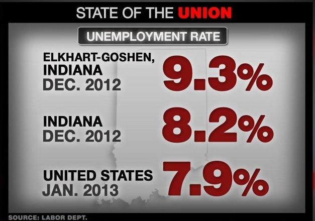 As the president prepares to deliver his State of the Union address, the progress of the recovery in Elkhart tells the story of America: Things are better, but not back to where they were before the economy crashed in 2008. Elkhart’s unemployment rate is now 9.3%, down from 19.4% in February of 2009, but still above the state and national average.