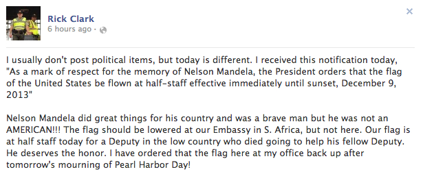 Sheriff Rick Clark of Pickens County, South Carolina, wrote on Facebook that while South Africa’s first black president “did great things for his country and was a brave man,” he would not lower his office’s flag to honor a foreign man.