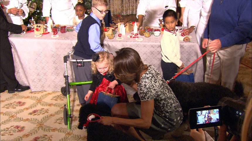 First lady Michelle Obama invited military families to scope out the holiday decorations Wednesday in the White House’s newly decked halls. Then the first family’s second dog grabbed the spotlight.
